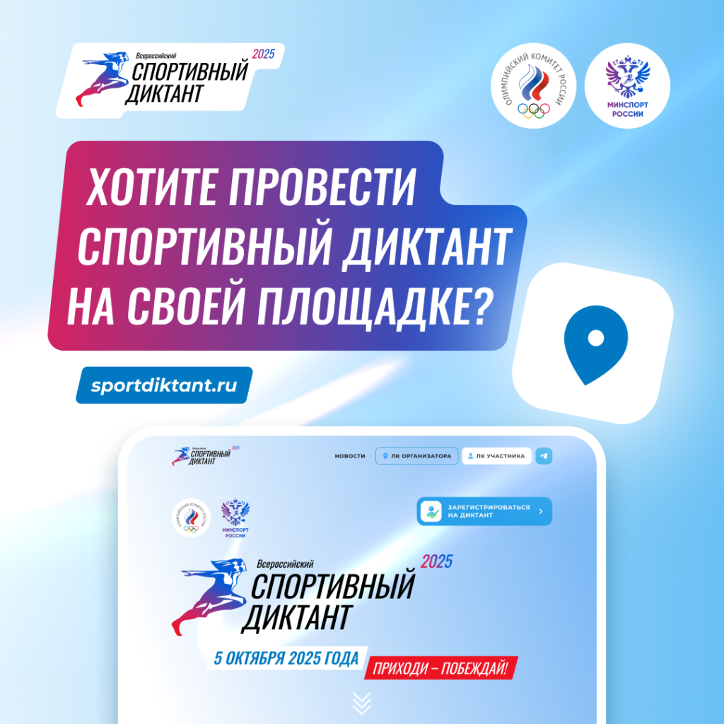 Для проведения Спортивного диктанта зарегистрированы уже более 400 площадок. Если хотите провести диктант у себя – оставляйте заявку на официальном сайте https://sportdiktant.ru/ , станьте частью большого спортивного события!