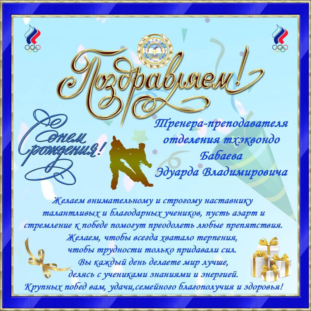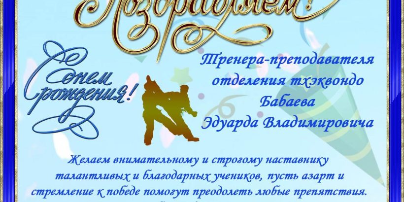 Поздравляем с Днём рождения тренера-преподавателя отделения тхэквондо Эдуарда Бабаева! Опубликовано 23 Октябрь, 2025 от Igor Навигация по записям « 23 и 24 октября сеансы в закрытом бассейне «Дельфин» с 12:00 до 15:00 отменяются.Первенство ГБУ ДО РО «СШОР № 13» по хоккею! »