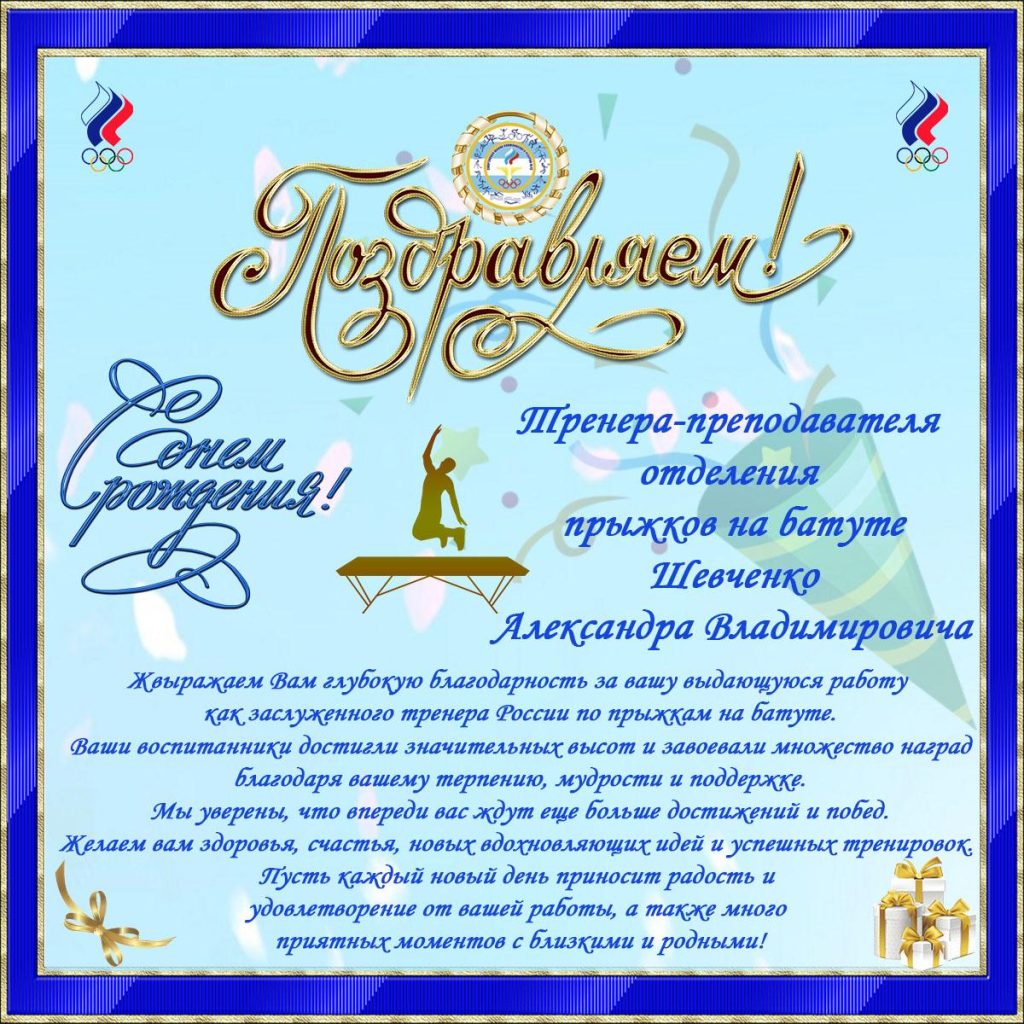 Поздравляем с Днём рождения Заслуженного тренера России, тренера-преподавателя отделения прыжков на батуте Александра Шевченко! Опубликовано 6 Ноябрь, 2025 от Igor Навигация по записям « Поздравляем с Днём рождения заведующего спортивным сооружением Елену Дикую!Захватывающие моменты матчевой встречи по боксу! »