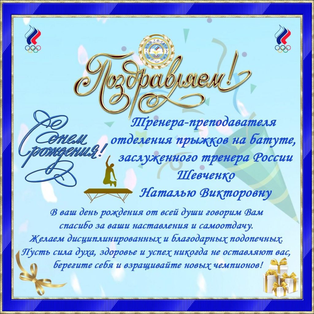 Поздравляем с Днём рождения тренера-преподавателя отделения прыжков на батуте, заслуженного тренера России Наталью Шевченко! Опубликовано 4 Январь, 2026 от Igor Навигация по записям « Расписание сеансов с 5 по 11 января