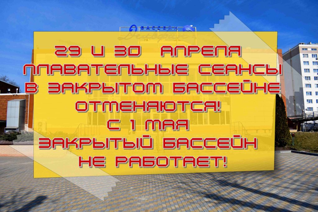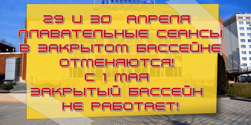 Уважаемые посетители 29 и 30 апреля плавательные сеансы в закрытом бассейне отменяются! (в связи с проведением соревнований) С 1 Мая закрытый бассейн не работает! Опубликовано 24 Апрель, 2026 от Igor Навигация по записям « Мы разные, но #МЫВМЕСТЕ: стартовал 6 сезон Международной Премии #МЫВМЕСТЕЭстафета «Мои финансы»: учимся инвестировать просто и понятно! »