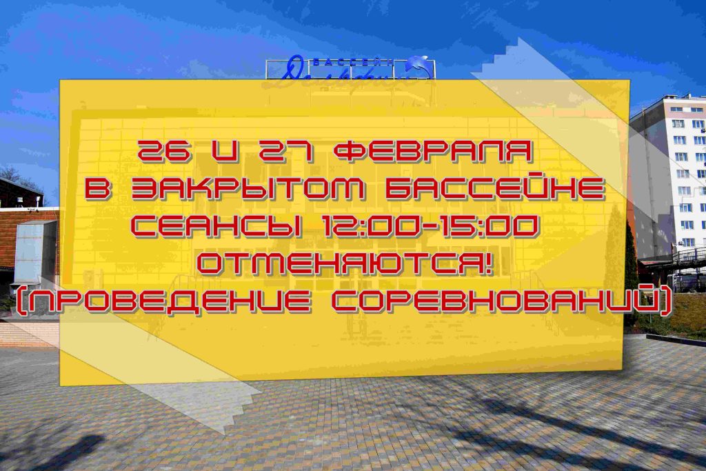 26 и 27 февраля в закрытом бассейне «Дельфин» сеансы 12:00-15:00 отменяются‼ Опубликовано 24 Февраль, 2026 от Igor Навигация по записям « Кубок Ростовской области по плаванию и XVIII Спортивные юношеские Игры Дона 2026 года!